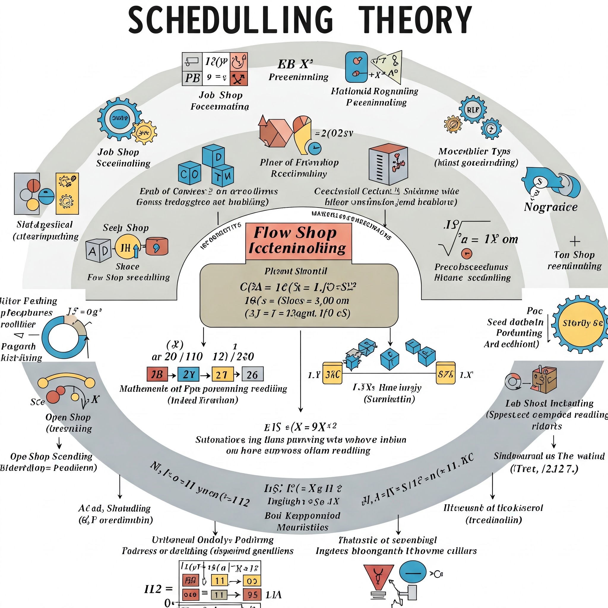 - NP-완전(NP-complete) 또는 NP-어려움(NP-hard)으로 분류되는 스케줄링 문제에 대해 근사 알고리즘, 휴리스틱, 메타휴리스틱(예: 유전 알고리즘, 시뮬레이티드 어닐링) 기법을 사용합니다.